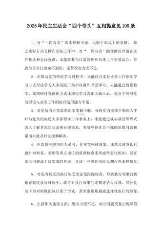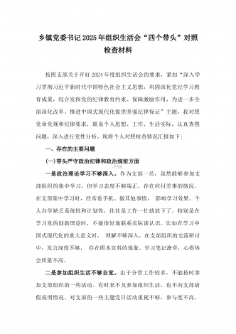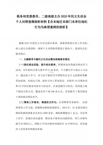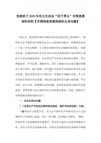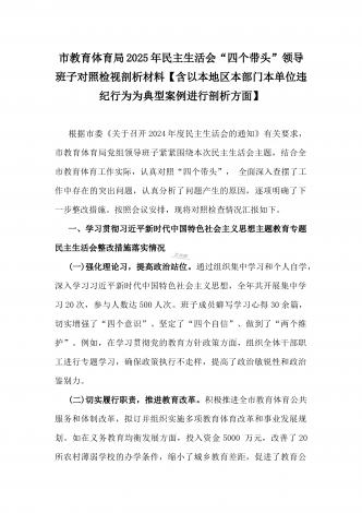 市教育体育局2025年民主生活会“四个带头”领导班子对照检视剖析材料【含以本地区本部门本单位违纪行为为典型案例进行剖析方面】根据市委《关于召开2024年度民主生活会的通知》有关要求,市教育体育局党组领导班子紧紧围绕本次民主生活会主题,结合全市教育体育工作实际,认真对照“四个带头”,全面深入查摆了工作中存在的突出问题,认真分析了问题产生的原因,逐项明确了下一步整改措施。按照会议安排,现将对照检查情况汇报如下。一、学习贯彻习近平新时代中国特色社会主义思想主题教育专题民主生活会整改措施落实情况(一)强...