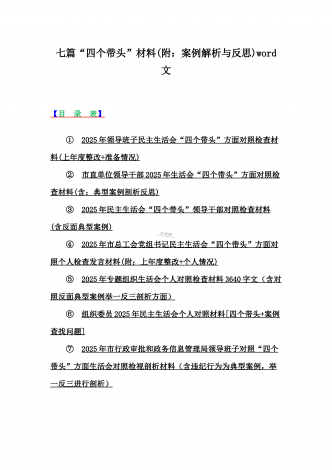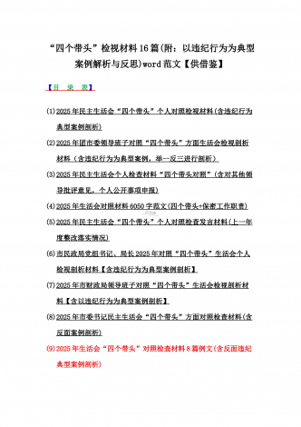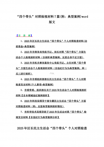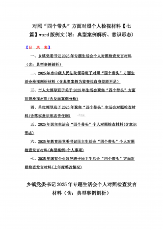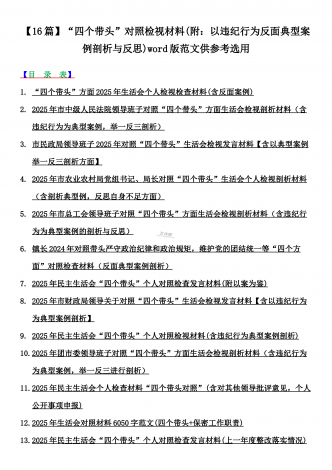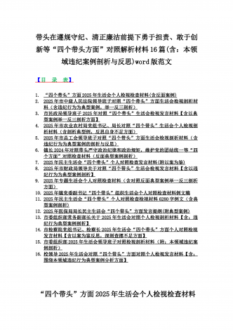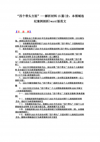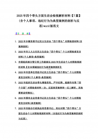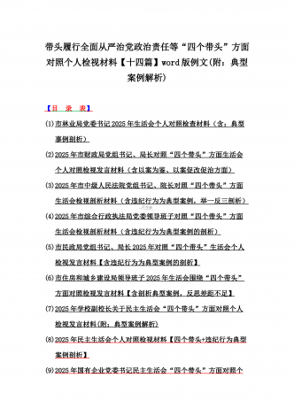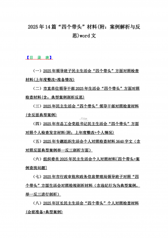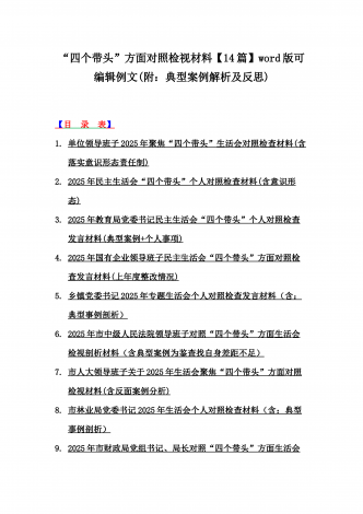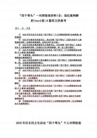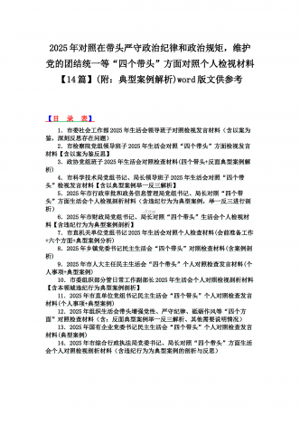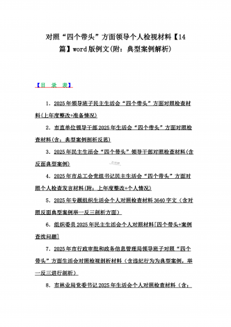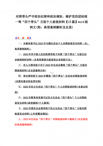 2025年对照在带头严守政治纪律和政治规矩,维护党的团结统一等“四个带头”方面对照个人检视材料【14篇】(附:典型案例解析)word版文供参考【目录表】1.市委社会工作部2025年生活会领导班子对照检视发言材料(含以案为鉴,深刻反思存在问题)2.市检察院党组领导班子2025年生活会对照“四个带头”方面检视发言材料【含以案为鉴反思】3.政协党组班子2025年生活会对照检查材料(四个带头+反面典型案例解析)4.市科学技术局党组书记、局长领导班子2025年生活会对照“四个带头”检视发言材料【含以典型案...