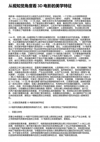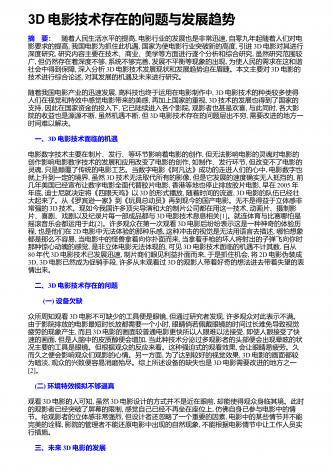 3D电影技术存在的问题与发展趋势摘 要: 随着人民生活水平的提高, 电影行业的发展也是非常迅速, 自零九年起随着人们对电影要求的提高, 我国电影为抓住此机遇, 国家为使电影行业突破新的高度, 引进3D电影对其进行深度研究, 研究内容主要在技术、商业、美学等方面进行逐个分析和综合研究, 虽然研究范围较广, 但仍然存在着深度不够, 系统不够完善, 发展不平衡等现象的出现, 为使人民的求在这和谐社会中得到保障, 深入分析3D电影技术发展现状和发展趋势迫在眉睫。本文主要对3D电影的技术进行综合论述...