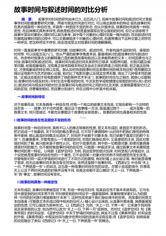 故事时间与叙述时间的对比分析 摘 要:叙事学对时间的研究由来已久,且五花八门,但其中故事时间和叙述时间才是叙事学时间的最重要研究对象。两者与现实时间进行对比,可以得出其根本的特征:首先故事时间在其内部具有一种自在性,并具有一种固定不变的形态,但从外围来说,故事的时间具有一种规定性,而且其模式具有多样性;再就是叙述时间是直接展现在受众面前的时间,但它必须依附于故事中某些对象的心理时间以其为参考,其中每个对象的心理时间是一维向前的,而且叙述时间在展现故事时间的过程中,可以交替展现多个对象的...