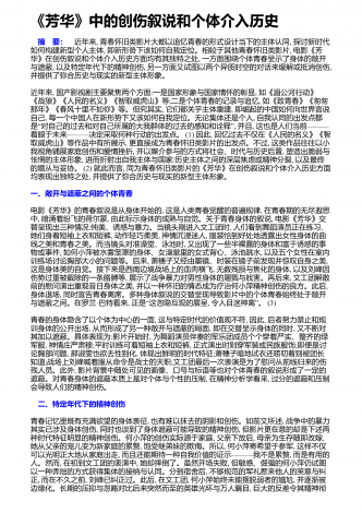 《芳华》中的创伤叙说和个体介入历史 摘 要: 近年来, 青春怀旧类影片大都以追忆青春的形式设计当下的主体认同, 探讨新时代如何构建新型个人主体, 即新形势下该如何自我定位。相较于其他青春怀旧类影片, 电影《芳华》在创伤叙说和个体介入历史方面均有其独特之处, 一方面围绕个体青春呈示了身体的敞开与遮蔽, 以及特定年代下的精神创伤, 另一方面又试图以两个异质时空的对话来缓解或抵消创伤,并提供了弥合历史与现实的新型主体形象。近年来, 国产影视剧主要聚焦两个方面:一是国家形象与国家情怀的彰显, 如《...