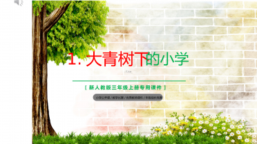 1.大青树下的小学[新人教版三年级上册专用课件]小学公开课/教学比赛/优秀教师课件/年级组长竞赛第一课时你知道这是哪些少数民族吗?一、学会本课生字词,能正确、流利、有感情的朗读课文。二、能和同学交流课文中有新鲜感的句子,说一说这所学校的特别之处。三、正确、流利、有感情地朗读课文,读出对这所小学的喜爱之情。学习目标这些小朋友来自不同的民族,他们将要走进一个共同的地方,那就是:大青树下的小学。走进作者吴然:云南人,现代著名作家,中国作家协会会员,主要致力于儿童散文和散文诗创作。1973年在《云南日报...