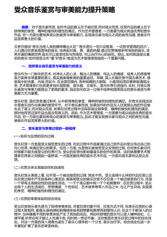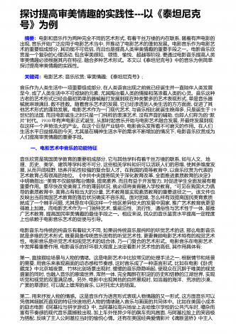 探讨提高审美情趣的实践性---以《泰坦尼克号》为例 摘要:电影和音乐作为两种完全不同的艺术形式,有着千丝万缕的内在联系,随着有声电影的出现,音乐开始广泛应用于电影艺术当中,并推动了电影艺术的蓬勃发展。电影音乐作为电影艺术的重要组成部分,其功能不可低估,而且也是提高人类审美情趣的重要手段之一。电影音乐欣赏是一个复杂的心理活动,包含审美感知、领悟、愉悦、超越等阶段,要通过电影音乐提高人类审美情趣必须根据其内在特征,融合多种艺术形式。本文以《泰坦尼克号》中的音乐为例简单探讨提高审美情趣的实践性。 关键...