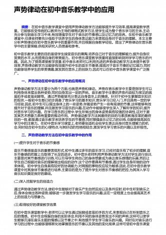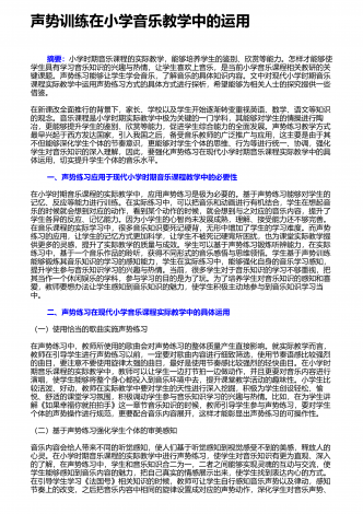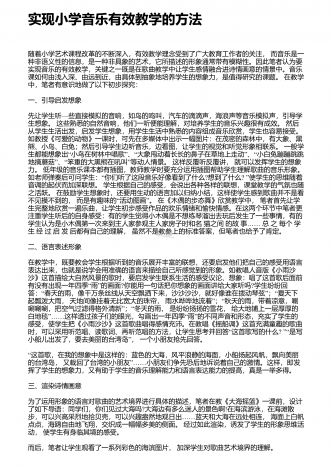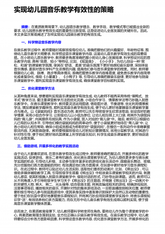 实现幼儿园音乐教学有效性的策略 摘要:在素质教育背景下,幼儿园音乐教学理念、教学手段、教学模式等已被提出全新的要求,幼儿园音乐教学有效生成的重要性日渐显现,这是促进幼儿全面发展的关键所在。因此,本文多层次客观阐述了怎样实现幼儿园音乐教学的有效生成。 一、科学预设音乐教学内容在音乐教学过程中,教师要随时观察班级每位幼儿,准确把握他们的兴趣爱好、年龄特征等,围绕幼儿音乐教学大纲要求,科学预设音乐课堂教学内容,这是幼儿音乐教学有效生成的首要前提。在小班幼儿音乐教学中,教师要多角度准确把握小班幼儿身...