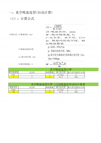 计算公式:真空吸盘选型计算吸吊物重量安全率吸盘数量最大真空度最大真空度的百分比W(N)tnpv(kpa)%75491.863%真空吸盘选型计算(已知吸盘直径反向计算重量)吸盘直径安全率吸盘数量最大真空度最大真空度的百分比D(mm)tnpv(kpa)%304291.863%一:真空吸盘选型(自动计算)(1):计算公式D:吸盘直径(mm)P:吸盘内的真空度pv:最大真空度,kpaW:吸吊物重量,N4t:;::t4t8pMPa;n:WDnpDmmWt吸盘直径,吸吊物重量,N;安全率。水平吊,≥;垂...