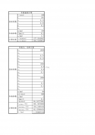 车削速度计算查表系数1002910.150.35m0.21车削参数100f(mm/r)0.22.5计算结果177.3542047564.5359672车削力、功率计算查表系数265010.75-0.15119500.90.6-0.31288010.5-0.41车削参数60n(r/min)5002f(mm/r)0.2v(m/min)94.24777961计算结果801.5076969354.240544493.478994541.259005346T(min)CvxvyvkMd0(mm)ap(mm...