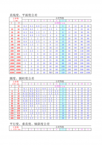 直线度、平面度公差公差等级1234567891011〉100.20.40.81.2235812203010160.250.511.52.5461015254016250.30.61.223581220305025400.40.81.52.546101525406040630.5123581220305080631000.61.22.54610152540601001001600.81.53581220305080120160250124610152540601001502504001.22.55...