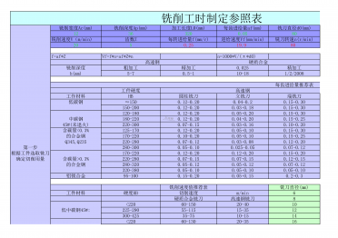 铣削工时制定参照表12363200.05802050.2519.980f=af*ZVf=f*n=af*Z*nn=1000*V/(π*d0)高速钢硬质合金铣削深度粗加工精加工0.025精加工h(mm)5-70.5-110-181/2/2008每齿进给量推荐表工件硬度高速钢工作材料HB圆柱铣刀立铣刀端铣刀低碳钢≈1500.12-0.200.04-0.20.15-0.30150-2000.12-0.200.03-0.180.15-0.30120-1800.12-0.200.05-0.200.15-0....