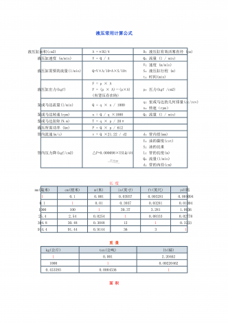 液压常用计算公式 液压缸面积(cm2) A=πD2/4 D:液压缸有效活塞直径(cm)液压缸速度(m/min) V=Q/A Q:流量(l/min)液压缸需要的流量(l/min) Q=V×A/10=A×S/10t V:速度(m/min) S:液压缸行程(m) t:时间(min)液压缸出力(kgf) F=p×A F=(p×A)-(p×A) (有背压存在時) p:压力(kgf/cm2)泵或马达流量(l/min) Q=q×n/1000 q:泵或马达的几何排量(cc/rev)...