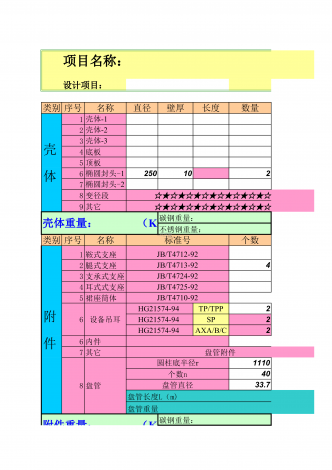 项目名称:设计项目:类别序号名称直径壁厚长度数量1234底板5顶板625010278变径段☆★☆★☆★☆★☆★☆★☆★☆★☆9其它☆★☆★☆★☆★☆★☆★☆★☆★☆碳钢重量:类别序号名称标准号个数1鞍式支座JB/T4712-922腿式支座JB/T4713-9243支承式支座JB/T4724-924耳式式支座JB/T4725-925裙座筒体JB/T4710-926设备吊耳HG21574-94TP/TPP2HG21574-94SP2HG21574-94AXA/B/C26内件7其它盘管附件8盘管111...
