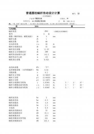 普通圆柱蜗杆传动设计计算编号:12(双导程蜗杆)YKS3116计算者:M61201/611012001.03.12符号几何参数:蜗杆类型ZN1(齿槽法向直廓蜗杆)旋向右旋模数(蜗杆轴向,蜗轮端面)m4mm蜗杆头数1蜗轮齿数60法向齿形角αn20度蜗杆分度圆直径45mm蜗杆直径系数q11.25蜗轮名义分度圆直径240mm蜗杆传动标准中心距142.5mm蜗杆传动中心距a145mm蜗轮变位系数0.6251齿厚增量系数(双导程蜗杆)Ks0.02顶隙系数c0.2蜗杆名义导程p12.56637mm蜗杆大导程...