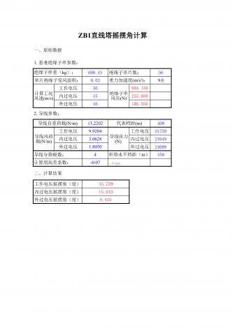 一、原始数据600.45绝缘子串片数:56单片绝缘子受风面积:0.039.8工作电压30948.150内过电压15237.038外过电压10105.35013.2202400工作电压9.9204工作电压31739内过电压3.0628内过电压24949外过电压1.8070外过电压24609导线分裂根数:4450计算用高差系数:-0.07二、计算结果工作电压摇摆角(度)45.759内过电压摇摆角(度)15.913外过电压摇摆角(度)9.455ZB1直线塔摇摆角计算1.悬垂绝缘子串参数:绝缘子串重(k...