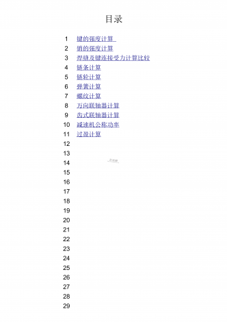 目录1234567891011121314151617181920212223242526272829键的强度计算销的强度计算焊缝及键连接受力计算比较链条计算链轮计算弹簧计算螺纹计算万向联轴器计算齿式联轴器计算减速机公称功率过盈计算结果单位一已知1T135N·m2L50mm3b20mm4ll=L-b30mm5D70mm6h12mm7kk=h/26mm840MPa9τp90Mpa二计算10PP=2T/Dkl21.42857142857MPa11ττ=2T/Dbl6.428571428571Mpa三...