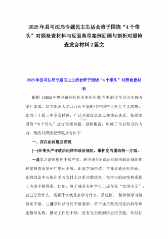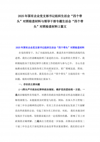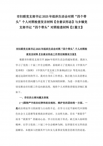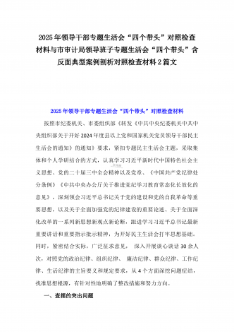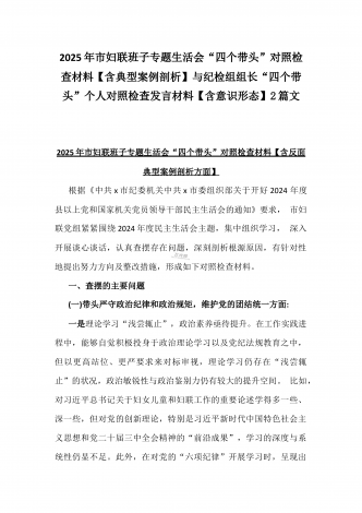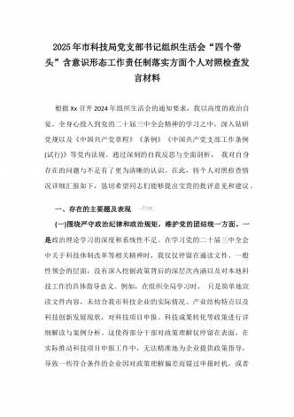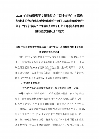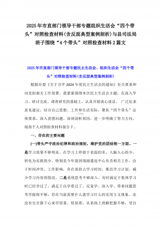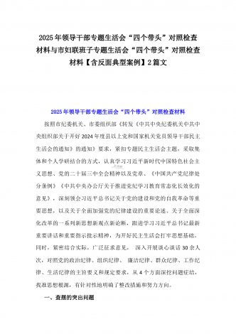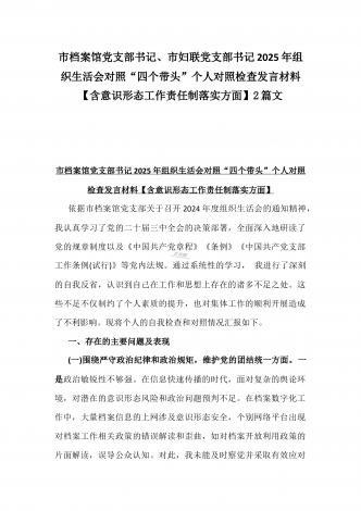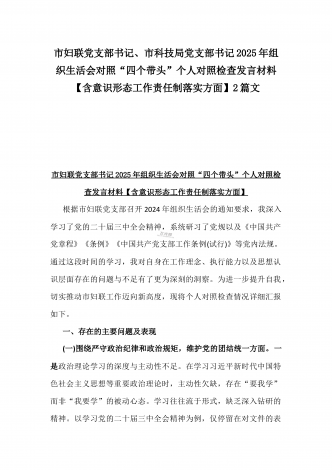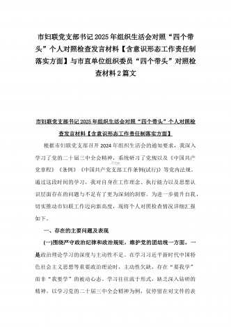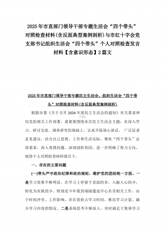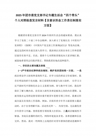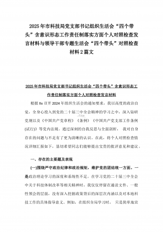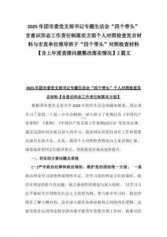 2025年团市委党支部书记专题生活会“四个带头”含意识形态工作责任制落实方面个人对照检查发言材料与市直单位领导班子“四个带头”对照检查材料【含上年度查摆问题整改落实情况】2篇文