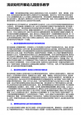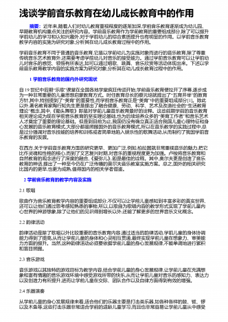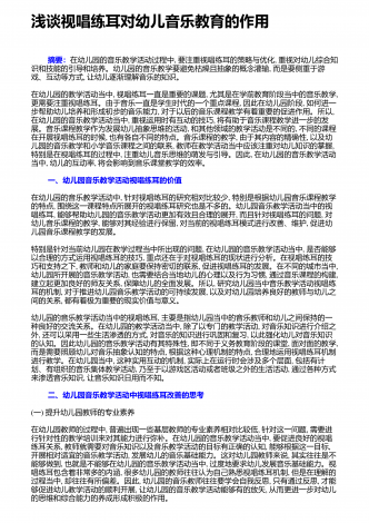 浅谈视唱练耳对幼儿音乐教育的作用 摘要:在幼儿园的音乐教学活动过程中,要注重视唱练耳的策略与优化,重视对幼儿综合知识和技能的引导和培养。幼儿园的音乐教学要避免枯燥且抽象的概念灌输,而是要侧重于游戏、互动等方式,让幼儿逐渐理解音乐的知识。在幼儿园的教学活动当中,视唱练耳一直是重要的课题,尤其是在学前教育阶段当中的音乐教学,更需要注重视唱练耳。由于音乐一直是学生时代的一个重点课程,因此在幼儿园阶段,如何进一步帮助幼儿培养和形成初步的音乐能力,对于以后的音乐课程教学有着重要的促进作用。所以,在幼儿园...