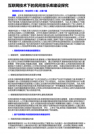 互联网技术下的民间音乐库建设探究 民间音乐论文(专业研究10篇)之第六篇 摘要:近年来,我国民族民间音乐有许多已经消逝在历史长河中,人们也越来越少听到民族民间音乐,而民族民间音乐作为我国民族文化的重要组成部分,其不仅体现着民族的人文风情,更是民族文化不断发展的精华所在,因此,保护民族民间音乐已经到了迫在眉睫的程度。互联网技术的不断发展,为民族民间音乐的传承与共享提供了有利的发展条件。为此,本文便探讨了民族民间音乐库建设的重要意义,并对基于互联网技术的民族民间音乐库建设进行了深入的研究,并对民...
