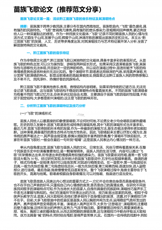 苗族飞歌论文(推荐范文分享) 苗族飞歌论文第一篇:浅谈黔江苗族飞歌的音乐特征及其演唱特点 摘要:苗族属于跨界少数民族,主要分布在国内西南地区。苗族歌曲内,“”飞歌最负盛名,具“”有强烈的民族特色。飞歌音调高亢嘹亮,具有强烈的音乐感染力,歌唱期间回声嘹亮,豪迈奔放给人以一种深邃豁达的感觉。作为一种民族文化载体,“”飞歌记录不同时期苗族人民的心情与生活方式,它萌生于山间,发展于山间,辉煌于山间,“淋漓尽致的展现出苗族历史和文化。本文从黔”江苗族飞歌的发展、人文、历史等多角度出发,对其演唱技巧与艺...