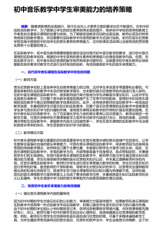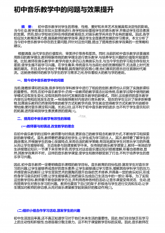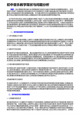 初中音乐教学现状与问题分析 摘要:自从课程改革实施以来,素质教育已经成为当前中学教育中的重要组成部分。在这样的大环境下,传统的初中音乐教学方式已经显得无力,如果不能快速对初中音乐教学方式进行革新,必然会影响初中音乐教育的发展。本文通过研究分析当前我国初中音乐教学普片存在的问题,并找出问题存在的根本原因,以期能给初中音乐教育的发展带来借鉴作用。 对于初中学生来说,为他们设置音乐课程,不是为了让他们在音乐领域有着多大的成就,主要目的是培养学生的审美能力和鉴赏能力,当学生还是一名初中生的时候,为他们...