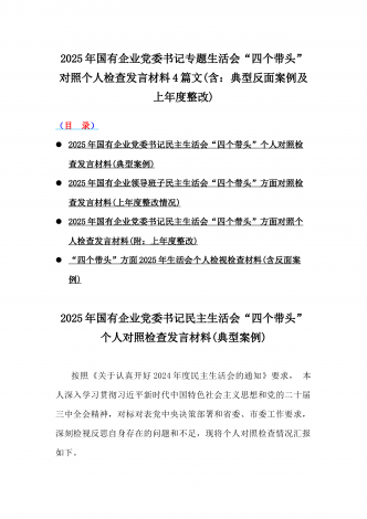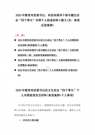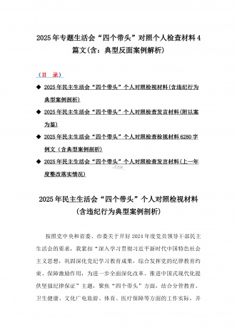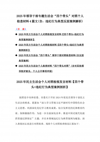 校领导2025年生活会对照“四个带头”方面对照个人检视发言材料【含:违纪行为典型案例分析】与市直单位领导干部“四个带头”方面对照检查材料(含:典型案例剖析反思)2篇范文校领导2025年生活会对照“四个带头”方面对照个人检视发言材料【含:围绕本领城违纪行为典型案例分析方面】按照市委关于开好2024年度党员领导干部民主生活会的有关要求,本人深入学习领会党的二十届三中全会精神和习近平总书记系列重要讲话精神,认真研读党章、《中国共产党纪律处分条例》等党内法规,聚焦本次民主生活会主题,结合分管工作实际,严...