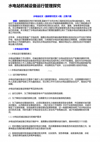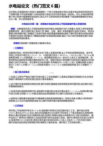水电站论文(热门范文6篇)众所周知,在我国的电力系统中,最重要的一个电力设备就是水电站,如果水电站的某些系统发生了故障问题,不仅会影响整个水电站的电力系统,还会对经济造成一定损失。所以,水电站既然是整个电力系统中最重要的组成部分,那么对于它的检修就非常的重要,下面是搜索整理的水电站论文6篇,供大家借鉴参考。 水电站论文第一篇:白鹤滩水电站泄洪洞上平段底板锚杆施工质量控制 摘要:白鹤滩泄洪洞上平洞段地质条件相对复杂,底板锚杆支护工程量大,现场工序衔接紧凑,“”质量要求高。通过对锚杆施工各项工序事...