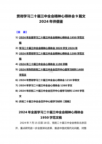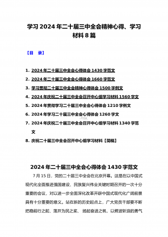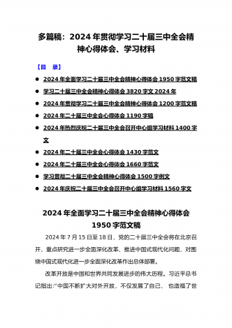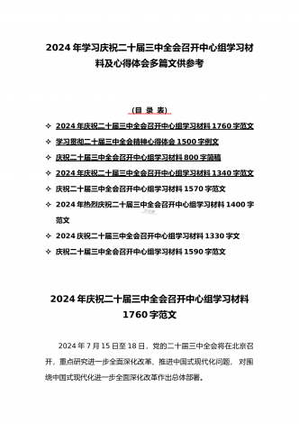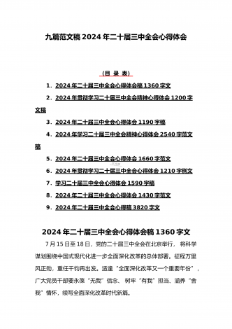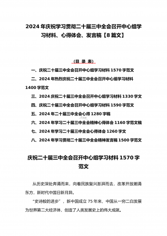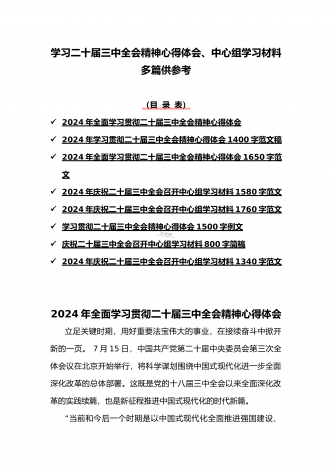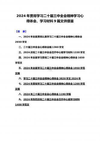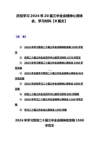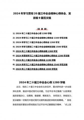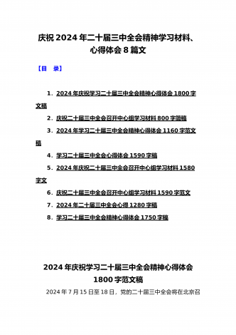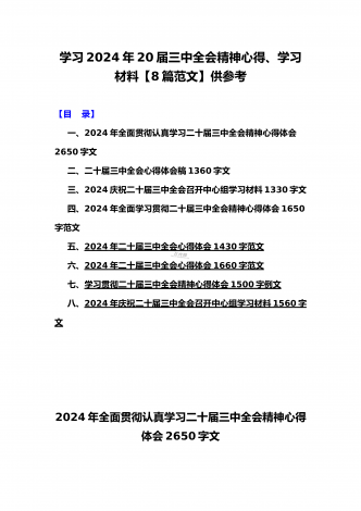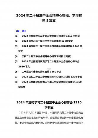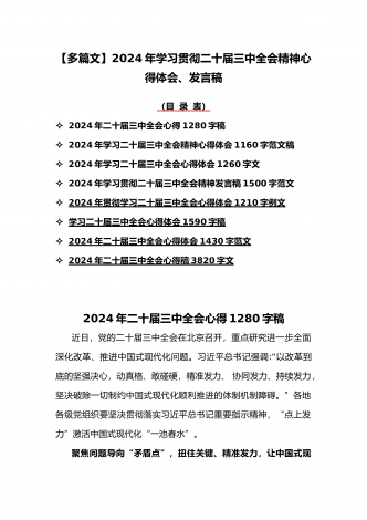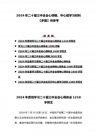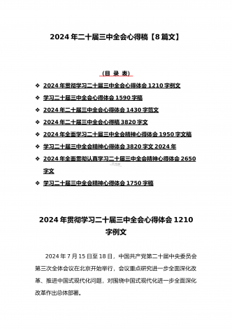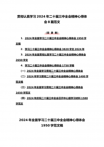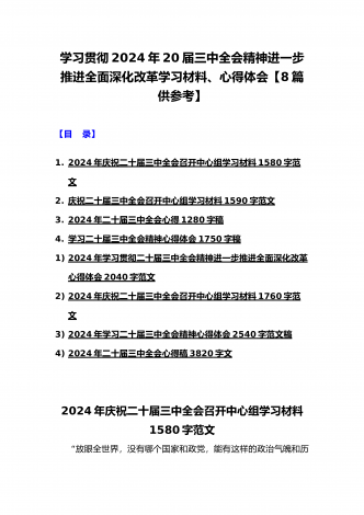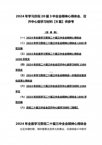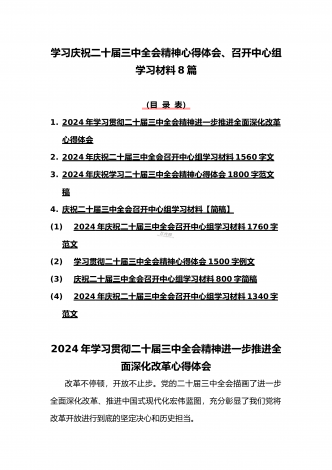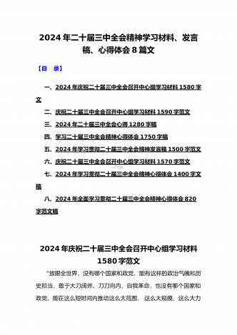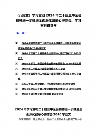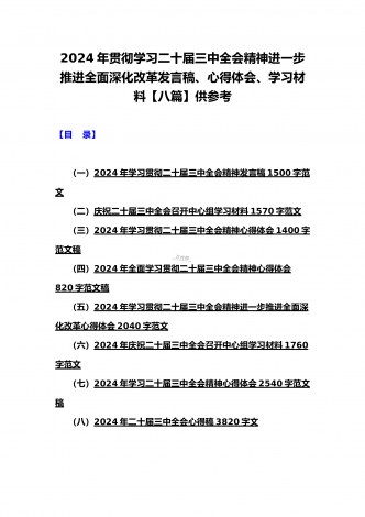 2024年贯彻学习二十届三中全会精神进一步推进全面深化改革发言稿、心得体会、学习材料【八篇】供参考【目录】(一)2024年学习贯彻二十届三中全会精神发言稿1500字范文(二)庆祝二十届三中全会召开中心组学习材料1570字范文(三)2024年学习贯彻二十届三中全会精神心得体会1400字范文稿(四)2024年全面学习贯彻二十届三中全会精神心得体会820字范文稿(五)2024年学习贯彻二十届三中全会精神进一步推进全面深化改革心得体会2040字范文(六)2024年庆祝二十届三中全会召开中心组学习材料17...