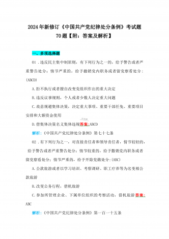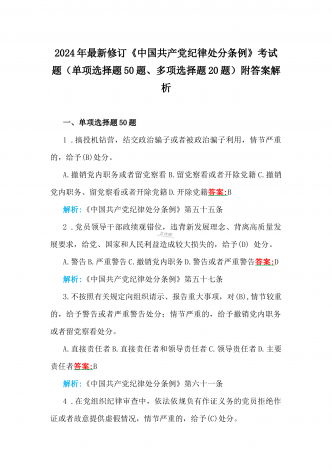 2024年最新修订《中国共产党纪律处分条例》考试题(单项选择题50题、多项选择题20题)附答案解析