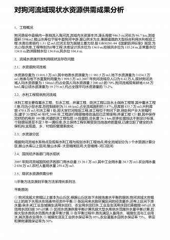 对狗河流域现状水资源供需成果分析1、工程概况狗河是绥中县境内一条独流入海河流,流域内水资源丰沛,源头海拔946.3m,河长为86.7km,流域面积539km2.猴山水库位于绥中县狗河中游,是以供水为主,兼顾灌溉的大型综合利用水利枢纽工程.水库总库容约1.51亿m3,拦河主坝为混凝土重力坝.按GB50201-94《国家防洪标准》规定,为大(2)型水库,Ⅱ工程等别为等工程.水库设计洪水位为134.0m,校核洪水位为135.24m,正常蓄水位134.0m,防洪限制水位134.0m,死水位104.4m....
