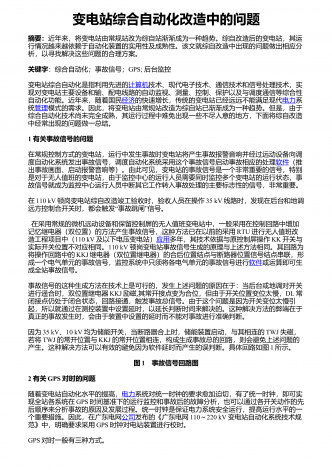 变电站综合自动化改造中的问题摘要:近年来,将变电站由常规站改为综自站渐渐成为一种趋势。综自改造后的变电站,其运行情况越来越依赖于自动化装置的实用性及成熟性。该文就综自改造中出现的问题做出相应分析,以寻找解决这些问题的合理方案。关键字:综合自动化;事故信号;GPS;后台监控变电站综合自动化是指利用先进的计算机技术、现代电子技术、通信技术和信号处理技术,实现对变电站主要设备和输、配电线路的自动监视、测量、控制、保护以及与调度通信等综合性自动化功能。近年来,随着国民经济的快速增长,传统的变电站已经远远...