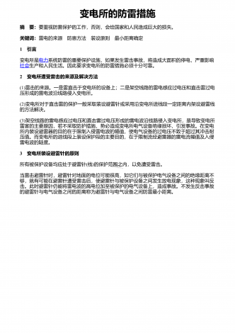 变电所的防雷措施 摘要:要重视防雷保护的工作,否则,会给国家和人民造成巨大的损失。关键词:雷电的来源防患方法装设原则最小距离确定1 引言变电所是电力系统防雷的重要保护设施,如果发生雷击事故,将造成大面积的停电,严重影响社会生产和人民生活。因此要求变电所的防雷措施必须十分可靠。2 变电所遭受雷击的来源及解决方法(1)雷击的来源。一是雷直击于变电所的设备上;二是架空线路的雷电感应过电压和直击雷过电压形成的雷电波沿线路侵入变电所。(2)变电所对于直击雷的保护一般采取装设避雷针或采用沿变电所进线段一定距...
