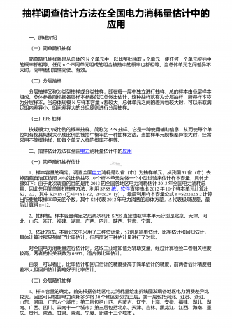 抽样调查估计方法在全国电力消耗量估计中的应用 一、原理介绍 (一)简单随机抽样 简单随机抽样就是从总体的N个单元中,以此整批抽取n个单元,使任何一个单元被抽中的概率都相等,任何n个不同单元组成的组合被抽中的概率也都相等。当总体单元之间差异不大时,简单随机抽样简便、有效。 (二)分层抽样 分层抽样又称为类型抽样或分类抽样,即在每一层中独立进行抽样,总的样本由各层样本组成,总体参数则根据各层样本参数的汇总做出估计,这种抽样就称为分层抽样,所得样本称为分层样本。当总体规模N与样本容量n都较大...