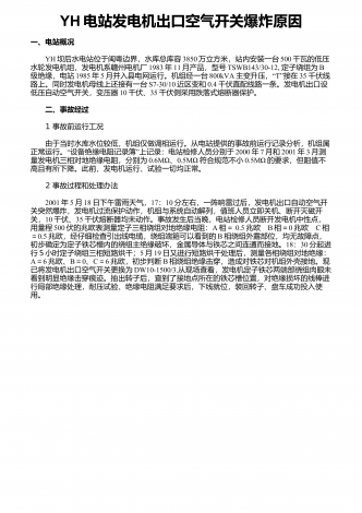 YH电站发电机出口空气开关爆炸原因一、电站概况 YH坝后水电站位于闽粤边界,水库总库容3850万立方米,站内安装一台500千瓦的低压水轮发电机组,发电机系赣州电机厂1983年11月产品,型号TSWB143/30-12, 定子绕组为B级绝缘,电站1985年5月并入县电网运行。机组经一台800kVA“主变升压,T”接在35千伏线路上。同时发电机母线上还接有一台S7-30/10近区变和0.4千伏直配线路一条。发电机出口设低压自动空气开关,变压器10千伏、35千伏侧采用跌落式熔断器保护。 二、事故经...