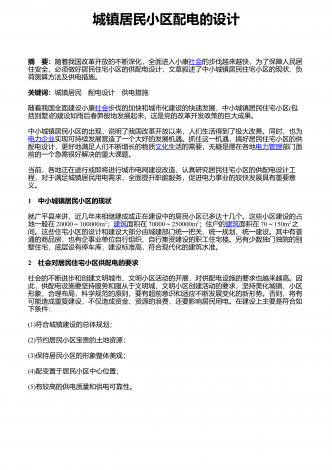 城镇居民小区配电的设计 摘要:随着我国改革开放的不断深化,全面进入小康社会的步伐越来越快,为了保障人民居住安全,必须做好居民住宅小区的供配电设计,文章叙述了中小城镇居民住宅小区的现状、负荷测算方法及供电措施。关键词:城镇居民配电设计供电措施随着我国全面建设小康社会步伐的加快和城市化建设的快速发展,中小城镇居民住宅小区(包括别墅)的建设如雨后春笋般地发展起来,这是党的改革开发政策的巨大成果。中小城镇居民小区的出现,说明了我国改革开放以来,人们生活得到了极大改善。同时,也为电力企业实现可持续发展营造...