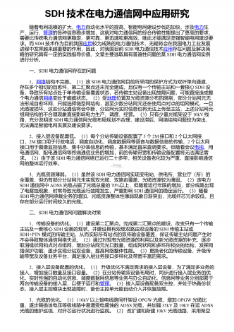 SDH技术在电力通信网中应用研究 随着电网规模的扩大、电力自动化水平的提高、智能电网建设步伐的加快,涉及电力生产、运行、管理的各种信息稳步增加,这就对电力通信网的综合传输性能提出了更高的要求,需要比传统电力通信网更稳定、更可靠、更迅速和更高效,唯此才能满足坚强智能电网建设要求。而SDH技术作为目前我国应用较为成熟的电力通信技术,无疑将会在我国电力工业发展进程中发挥越来越重要的作用,因此,对我国目前SDH电力通信技术应用存在问题及解决策略的研究具有一定的实践指导价值,文章主要选取具有普遍性问题的...
