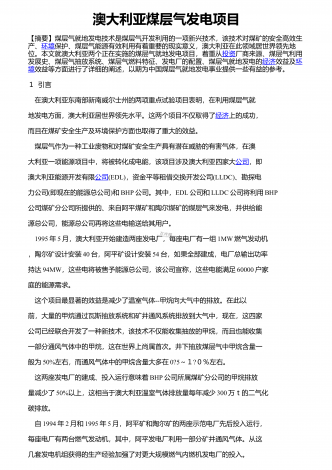 澳大利亚煤层气发电项目【摘要】煤层气就地发电技术是煤层气开发利用的一项新兴技术,该技术对煤矿的安全高效生产、环境保护、煤层气能源有效利用有着重要的现实意义,澳大利亚在此领域居世界领先地位。本文就澳大利亚两个正在实施的煤层气就地发电项目,着重从投资厂商来源、煤层气利用发展史、煤层气抽放系统、煤层气燃料特征、发电厂的配置、煤层气就地发电的经济效益及环境效益等方面进行了详细的阐述,以期为中国煤层气就地发电事业提供一些有益的参考。1引言在澳大利亚东南部新南威尔士州的两项重点试验项目表明,在利用煤层气就地...