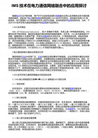 IMS技术在电力通信网络融合中的应用探讨 随着电力行业不断发展,用户对于比较新型的通行网络融合业务以及多媒体业务方面的需求越来越多。因此各个电力通信网络运营商选择以IMS技术作为依托,进而逐步实现IMS系统实验。由于我国在IMS网络融合技术上起步比较晚,在实际的技术应用经验尚浅,为此,下文对IMS技术在电力通信网络融合中的应用进行实际探讨。 1 IMS技术概述 IMS(IP Multimedia Subsystem),即IP多媒体子系统,本质上是一种网络体系架构。IMS最初应用于移动领域,...
