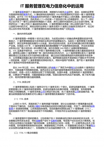 IT服务管理在电力信息化中的运用 IT服务管理来源于IT基础架构标准库,其能够为为相关企业研究、规划、实施和运营等方面提供有效的管理方式。IT基础架构标准库是在1980年的英国研究开发的一套IT服务管理标准库。由于在1980年的英语政府所研究的IT服务质量并不能让人民所满意,提供给相关企业的IT服务质量较差,因此责成CCTA启动某一个项目进行深入的调查研究,投入了一定时间之后开发了一套可以进地财务课题的IT资源,其可以提供本国政府以及企业进行使用。最终研究出一一套公开的IT基础架构标准库。IT...
