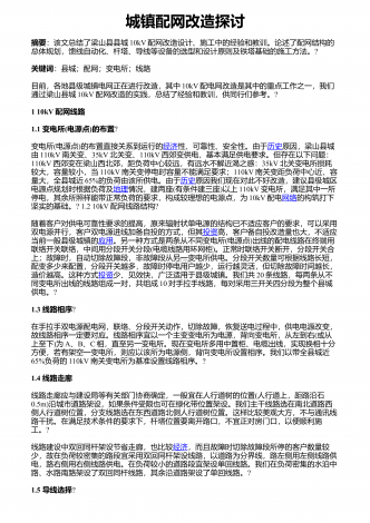 城镇配网改造探讨摘要:该文总结了梁山县县城10kV配网改造设计、施工中的经验和教训。论述了配网结构的总体规划,馈线自动化、杆塔、导线等设备的选型和设计原则及铁塔基础的施工方法。?关键词:县城;配网;变电所;线路目前,各地县级城镇电网正在进行改造,其中10kV配电网改造是其中的重点工作之一,我们通过梁山县城10kV配网改造的实践,总结了经验和教训,供同行们参考。?110kV配网线路1.1变电所(电源点)的布置?变电所(电源点)的布置直接关系到运行的经济性、可靠性、安全性。由于历史原因,梁山县城由1...