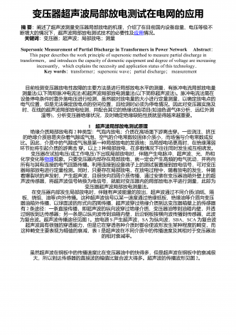 变压器超声波局部放电测试在电网的应用 摘要:阐述了超声波测量变压器局部放电的机理,介绍了在目前国内设备容量、电压等级不断增大的情况下,超声波局部放电测试技术的必要性及应用情况。关键词:变压器;超声波;局部放电;测量 Supersonic Measurement of Partial Discharge in Transformers in Power NetworkAbstract:Thispaperdescribestheworkprincipleofsupersonicmethodtome...