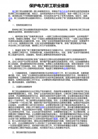 保护电力职工职业健康 电力职工职业健康问题一直以来都备受关注。早期由于电力 企业 并未制定出规范的制度来负责职工职业健康的问题,再加之,当时的发电技术水平比较低这,很多一线职工在工作几年后,身体都出现了不同程度的健康问题,对日后的生活产生了非常大的影响。现如今,国家、企业、职工自身都对职业健康非常关心,尤其是发电企业采取了专门的措施来保护职工职业健康。 一、控制危险源的方法 影响电力职工职业健康的危险源共有四种,对其进行有效的控制,是保护电力职工职业健康最突出的表现,具体控制方法如下:...
