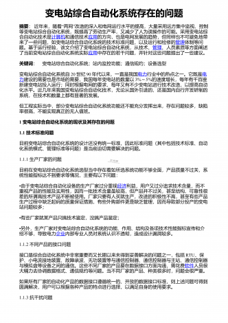 变电站综合自动化系统存在的问题摘要“”:近年来,随着两网改造的深入和电网运行水平的提高,大量采用远方集中监视、控制等变电站综合自动化系统,既提高了劳动生产率,又减少了人为误操作的可能。采用变电站综合自动化技术是计算机和通信技术应用的方向,也是电网发展的趋势,但同样也不可避免地带来了一些问题,如变电站综合自动化系统的技术标准问题,以及运行和检修的管理体制等问题。基于运行经验,该文介绍了变电站综合自动化系统,从技术、管理、人员素质等方面阐述了当前变电站综合自动化系统实际应用中存在的若干问题,并针对这...