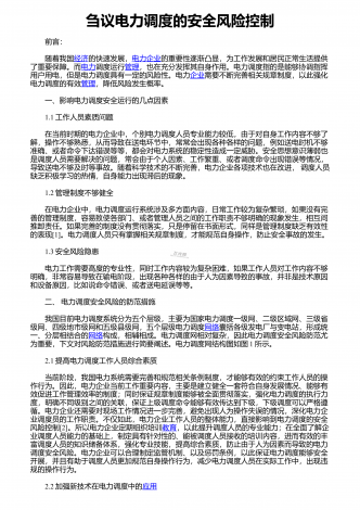 刍议电力调度的安全风险控制 前言: 随着我国经济的快速发展,电力 企业 的重要性逐渐凸显,为工作发展和居民正常生活提供了重要保障。而电力调度运行管理,也在充分发挥其自身作用。电力调度指的是能够协调指挥用户用电,但是电力调度具有一定的风险性。电力企业需要不断完善相关规章制度,以此强化电力调度的有效管理,降低风险发生概率。 一、影响电力调度安全运行的几点因素 1.1工作人员素质问题 在当前时期的电力企业中,个别电力调度人员专业能力较低,由于对自身工作内容不够了解,操作不够熟悉,从而导致...