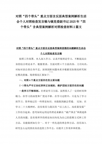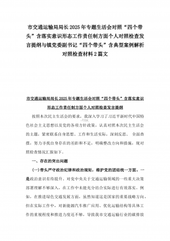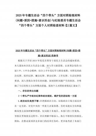 2025年专题生活会“四个带头”方面对照检视材料(问题+原因+措施+意识形态)与市财政局党组书记、局长对照“四个带头”对照检视发言材料(含以案为鉴、以案促改促治方面)2篇文2025年专题生活会“四个带头”方面对照检视材料(问题+原因+措施+意识形态)根据关于开好2024年度党员领导干部民主生活会的通知要求,本人紧扣本次民主生活会主题,深入学习新思想,认真领会党的XX届X中、X中全会精神,结合上半年党纪学习教育成果,对照党的政治纪律、组织纪律、廉洁纪律、群众纪律、工作纪律、生活纪律的要求,深入查找...