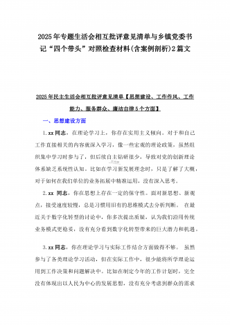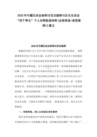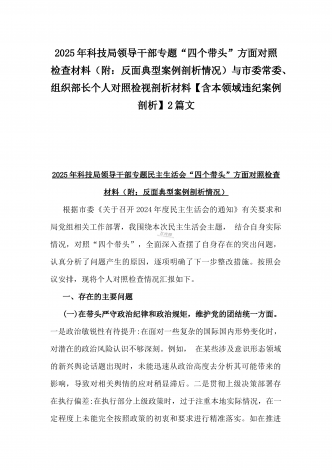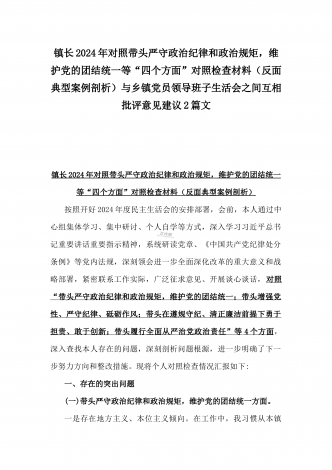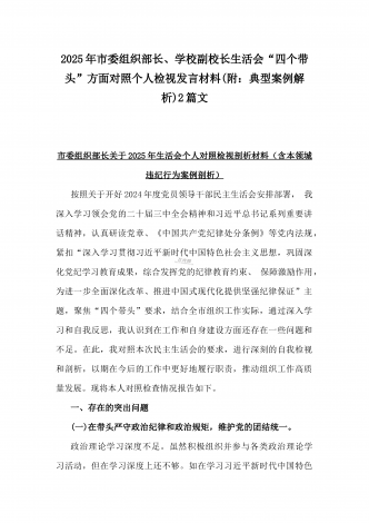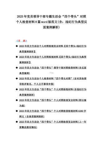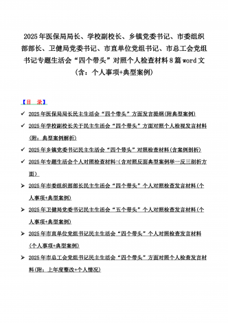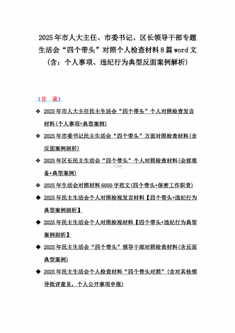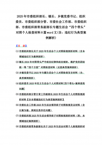2025年市委组织部长、镇长、乡镇党委书记、组织委员、市委组织部分管、市委社会工作部、市委组织部、市委组织部常务副部长专题生活会“四个带头”对照个人检查材料8篇word文(含:违纪行为典型案例解析)【目录】(1)市委组织部长关于2025年生活会个人对照检视剖析材料(含本领城违纪行为案例剖析)(2)镇长2024年对照带头严守政治纪律和政治规矩,维护党的团结统一等“四个方面”对照检查材料(反面典型案例剖析)(3)乡镇党委书记2025年专题生活会个人对照检查发言材料(含:典型事例剖析)(4)组织委员2...
