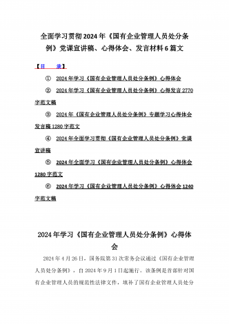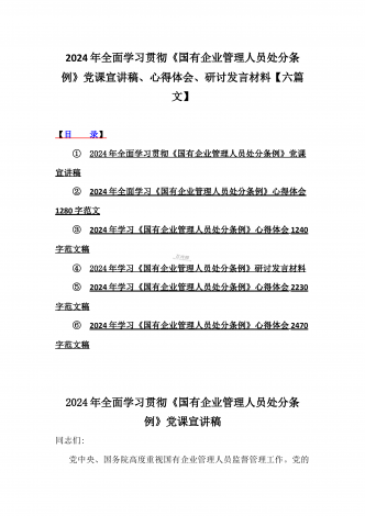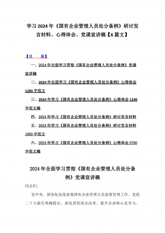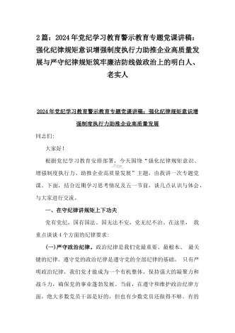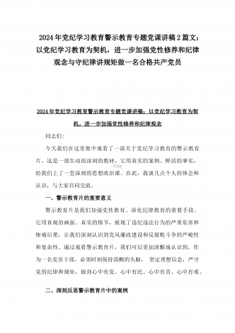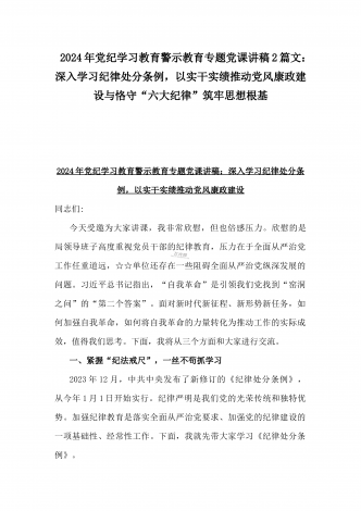 【两篇文】2024年党纪学习教育警示教育专题党课讲稿:以案明纪以纪正行,提升遵规守纪的高度自觉(六项纪律、典型案例)与党员干部自觉学纪、知纪、明纪、守纪,做遵规守纪的明白人2024年党纪学习教育警示教育专题党课讲稿:以案明纪以纪正行,提升遵规守纪的高度自觉(六项纪律、典型案例)同志们:《中国共产党纪律条例》明确了党的“六项纪律”:主要包括政治,组织和廉洁的纪律,群众的纪律,工作纪律和生活纪律。六项纪律为党员领导干部政治、廉洁、工作、生活等方方面面划定了纪律红线,是必须无条件遵守的准则。本次党纪学...