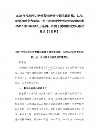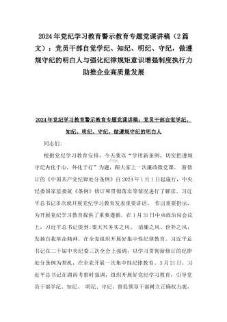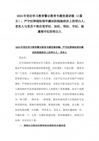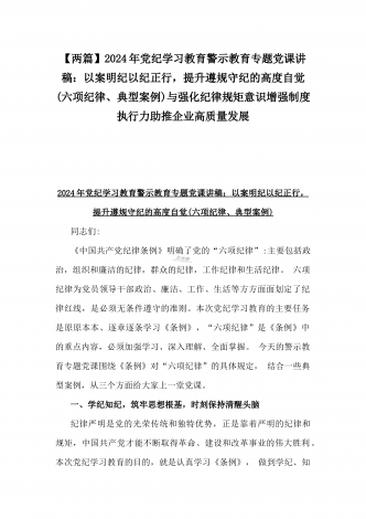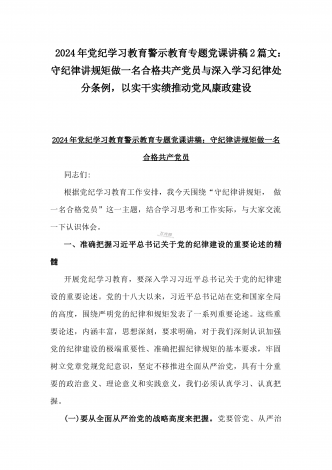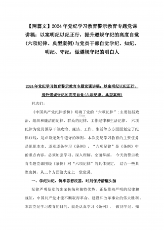 【两篇文】2024年党纪学习教育警示教育专题党课讲稿:以案明纪以纪正行,提升遵规守纪的高度自觉(六项纪律、典型案例)与党员干部自觉学纪、知纪、明纪、守纪,做遵规守纪的明白人