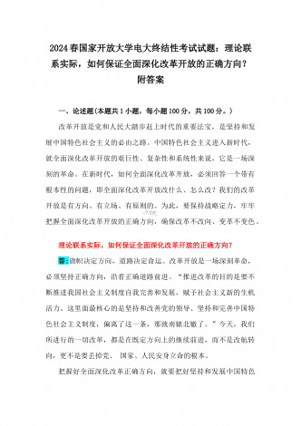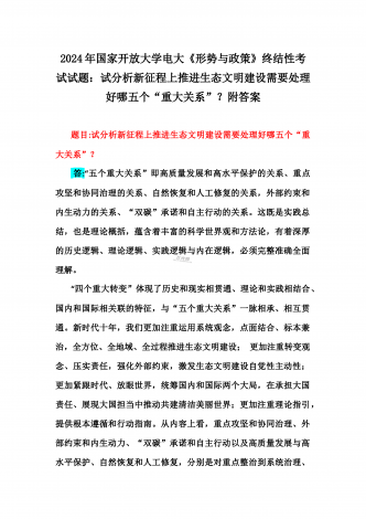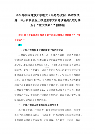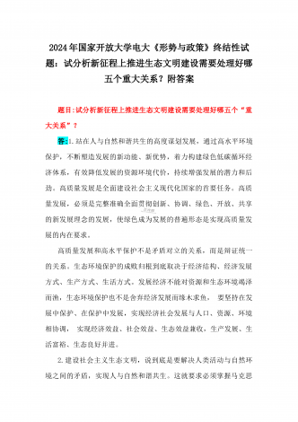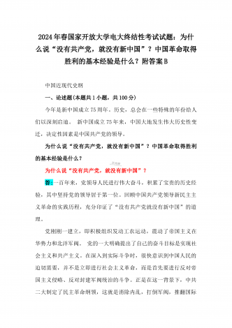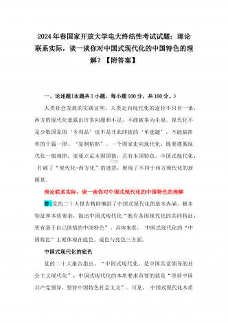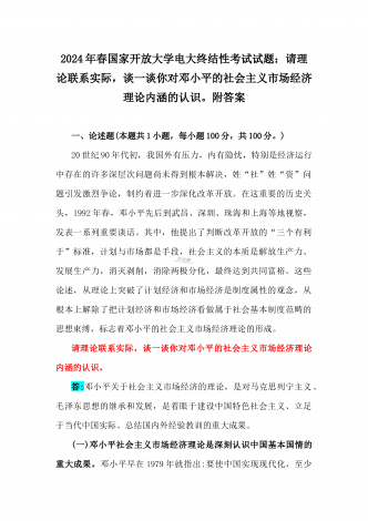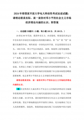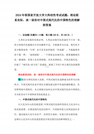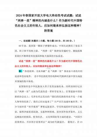 2024年春国家开放大学电大终结性考试试题:试述“两弹一星”精神的内涵是什么?作为新时代中国特色社会主义的年轻人,应如何继承和弘扬这种精神?附答案一、论述题(本题共1小题,每小题100分,共100分。)60年前,我国第一颗原子弹爆炸成功,中国从此拥有了保家卫国、捍卫和平的核力量。“两弹一星”精神也穿越时空,激励鼓舞着我们不断朝着科技强国和航天强国的目标前进。试述“两弹一星”精神的内涵是什么?作为新时代中国特色社会主义的年轻人,应如何继承和弘扬这种精神?答:“热爱祖国、无私奉献”是“两弹一星”事业...