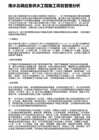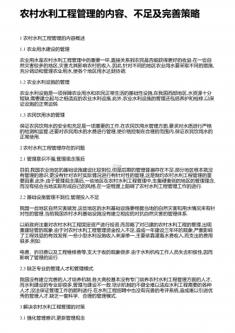 农村水利工程施工管理的特点、现状及发展对策近几年来,国家和政府加大了对农村的建设力度,给予农村和农民众多的政策优惠和扶持,实现对农村的统筹与规划就要面面俱到,也就离不开对农村水利工程的重视.就目前来说,我国广大农村的水利工程基本上处于小型的级别,因为大中型水利工程大部分都分布在城市内部以及城市边缘.我国的年总降水量虽然还算丰富,但是我国的水资源存在时空分布不均匀的问题,提高小型水利工程的管理水平,做好小型水利工程的管理工作不仅是有必要的,而且是相当重要的.建设新农村,水利要先行.1工程概况我国某...