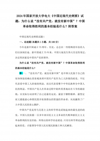 2024年国家开放大学电大《中国近现代史纲要》试题:为什么说“没有共产党,就没有新中国”?中国革命取得胜利的基本经验是什么?附答案