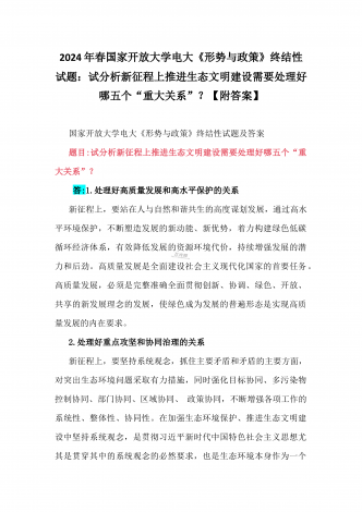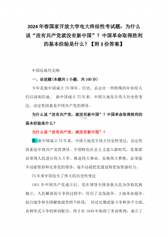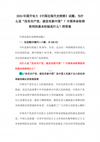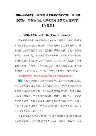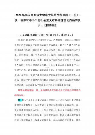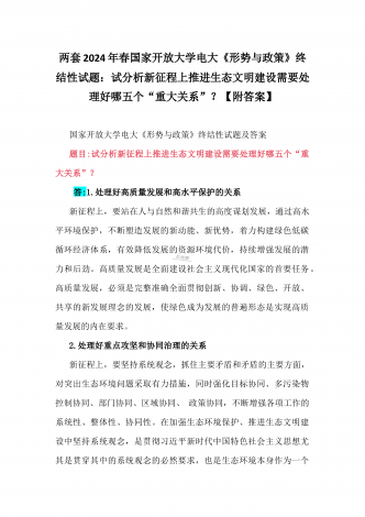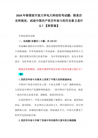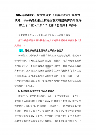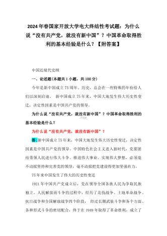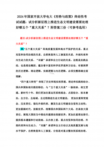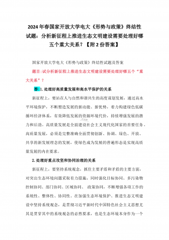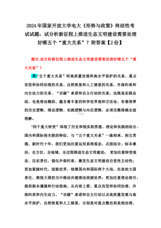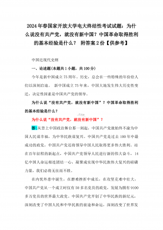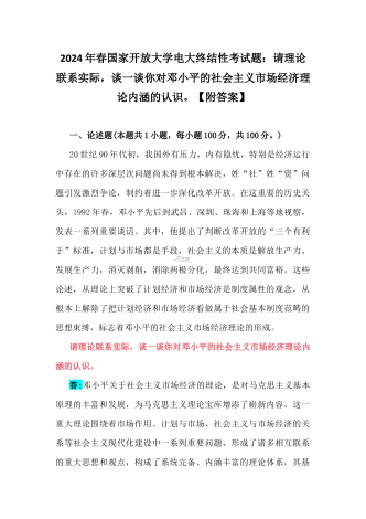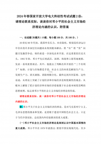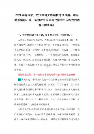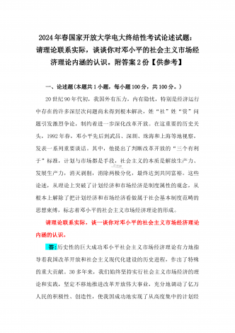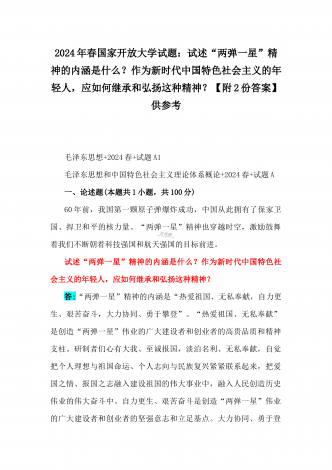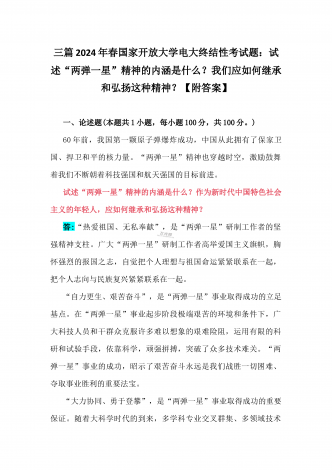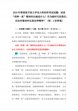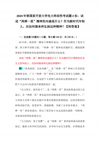 2024年春国家开放大学电大终结性考试题:试述“两弹一星”精神的内涵是什么?作为新时代中国特色社会主义的年轻人,应如何继承和弘扬这种精神?【附答案】一、论述题(本题共1小题,每小题100分,共100分。)60年前,我国第一颗原子弹爆炸成功,中国从此拥有了保家卫国、捍卫和平的核力量。“两弹一星”精神也穿越时空,激励鼓舞着我们不断朝着科技强国和航天强国的目标前进。试述“两弹一星”精神的内涵是什么?作为新时代中国特色社会主义的年轻人,应如何继承和弘扬这种精神?答:“热爱祖国、无私奉献”,是“两弹一星”...