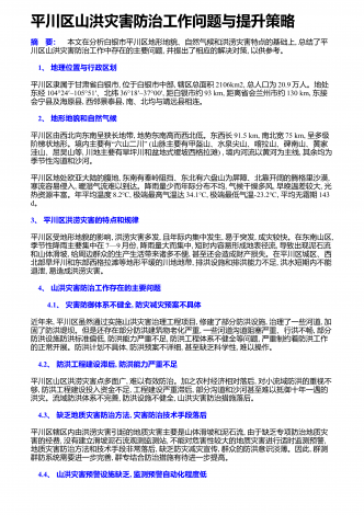 宁夏彭阳县山洪沟的分布、特征及防洪策略1山洪沟的分布、类型与特点宁夏彭阳地区地貌特征分三类地区,一是丘陵沟壑区,二是河谷川道区,三是土石山区。由于降水年内分布很不均匀,主要降水集中在7-9月,并多以暴雨的形式出现,因此,沟道发育、沟壑纵横、地形支离破碎,除土石山区植被较好,其他地区为严重侵蚀地貌,水土流失严重。1.1黄土丘陵沟壑区沟道发育、沟道密度大,由于植被差,水土流失非常严重,在主河道两侧,成树枝状分布着许多小支沟,这些小支沟流域面积较小,但沟道较陡,产流、汇流时间短,容易形成峰高量小的洪水...
